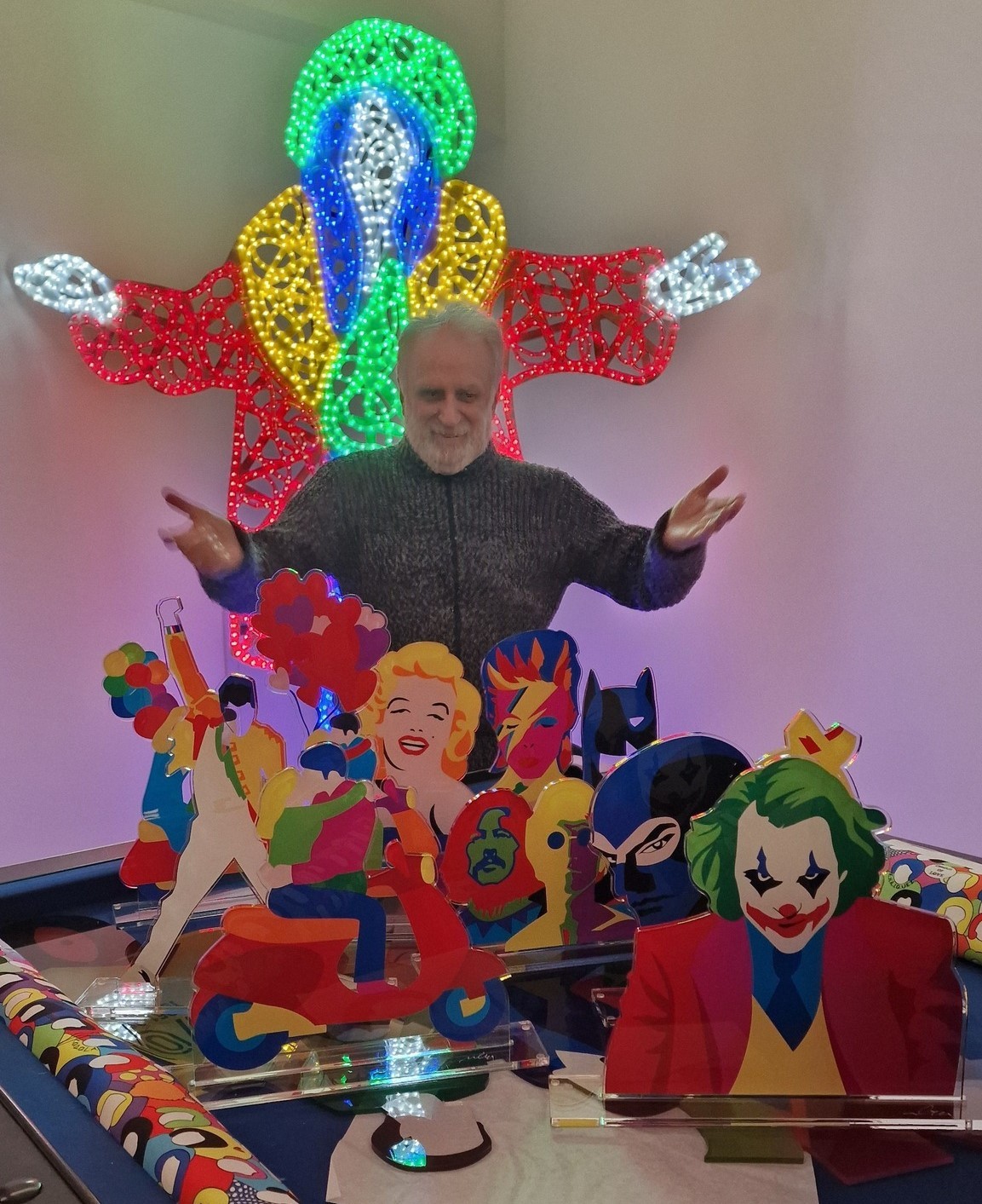 L’artista delle installazioni luminose all’Ariston di Sanremo. Le sue sculture luminose al neon e perspex sono conosciute in tutto il mondo, apprezzateda musei,gallerie,brand di moda,cinema e tv, Al festival di Sanremo per il settimo anno. Da sette anni, ormai, Maeco Lodola cura la scenografia esterna che trasforma il Teatro Ariston di Sanremo in occasione del Festival della Canzone Italiana. Un attaccamento alla causa, il suo, che supera in longevità persino quello del deus ex machina delle ultime cinque edizioni del Festival, il campione di ascolti Amadeus. E le installazioni luminose dell’artista pavese sono diventate un “appuntamento” atteso nella città dei fiori: per la 74esima edizione del Festival, Lodola ha circondato la scritta rossa dell’Ariston di volti profilati al neon, verdi, blu, rossi, gialli; ma è il riquadro con l’abbraccio tra Amadeus e Fiorello, su fondo giallo, ad attirare subito l’occhio, che poi si perde tra i riquadri colorati del “cubo di Rubik” come lo definisce lo stesso artista che illuminerà fino al 10 febbraio la facciata del teatro sanremese.